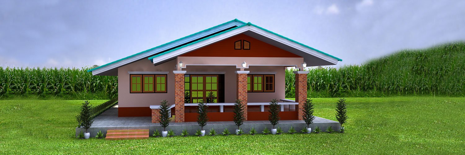แบบบ้านเกษตรม่อนแจ่ม แบบบ้านชั้นเดียว 2ห้องนอน 2ห้องน้ำ ห้องครัวพร้อมระเบียงหน้าบ้านงานก่อ อิฐบล็อก