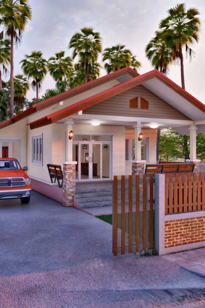 แบบบ้านเกษตรม่อนแจ่ม แบบบ้านชั้นเดียว 2ห้องนอน 2ห้องน้ำ ห้องครัวพร้อมระเบียงหน้าบ้านงานก่อ อิฐบล็อก