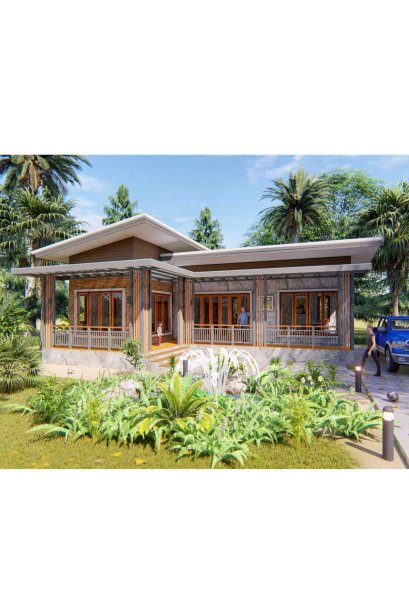 แบบบ้านชั้นเดียวยกพื้นสูง 1.00 เมตรทรงหลังคาโมเดิร์นหรือเพิงแหงนบ้าน 2ห้องนอน 1ห้องน้ำ ห้องครัว แบบบ้านแนวรีสอร์ทหรือบ้านพักตากอากาศ
