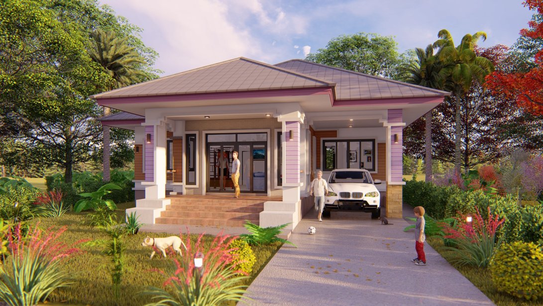 แบบบ้านชั้นเดียว 3 ห้องนอน 2ห้องน้ำทรงหลังคาปั้นหยา พื้นที่ใช้สอย 111 ตารางเมตร แบบบ้านสวย ทรงหลังคาที่เหมาะกับภูมิประเทศของไทย