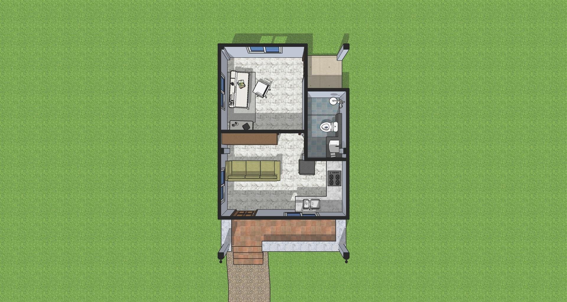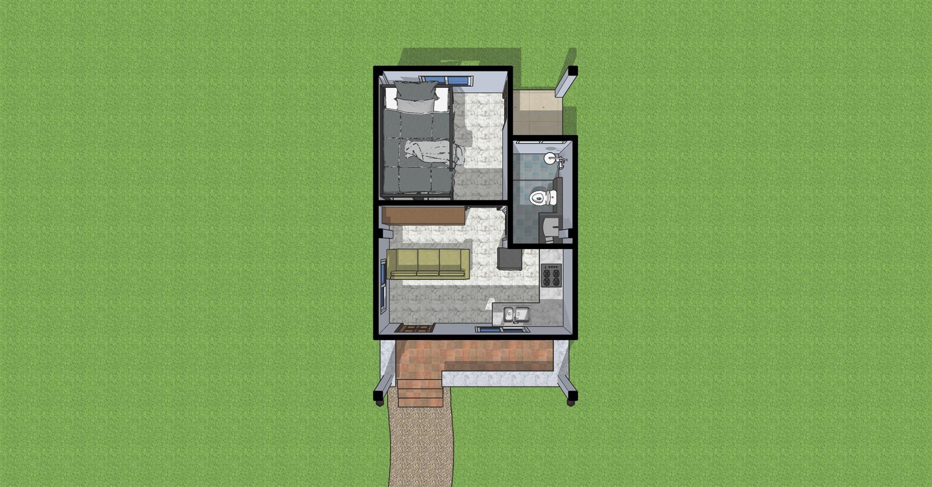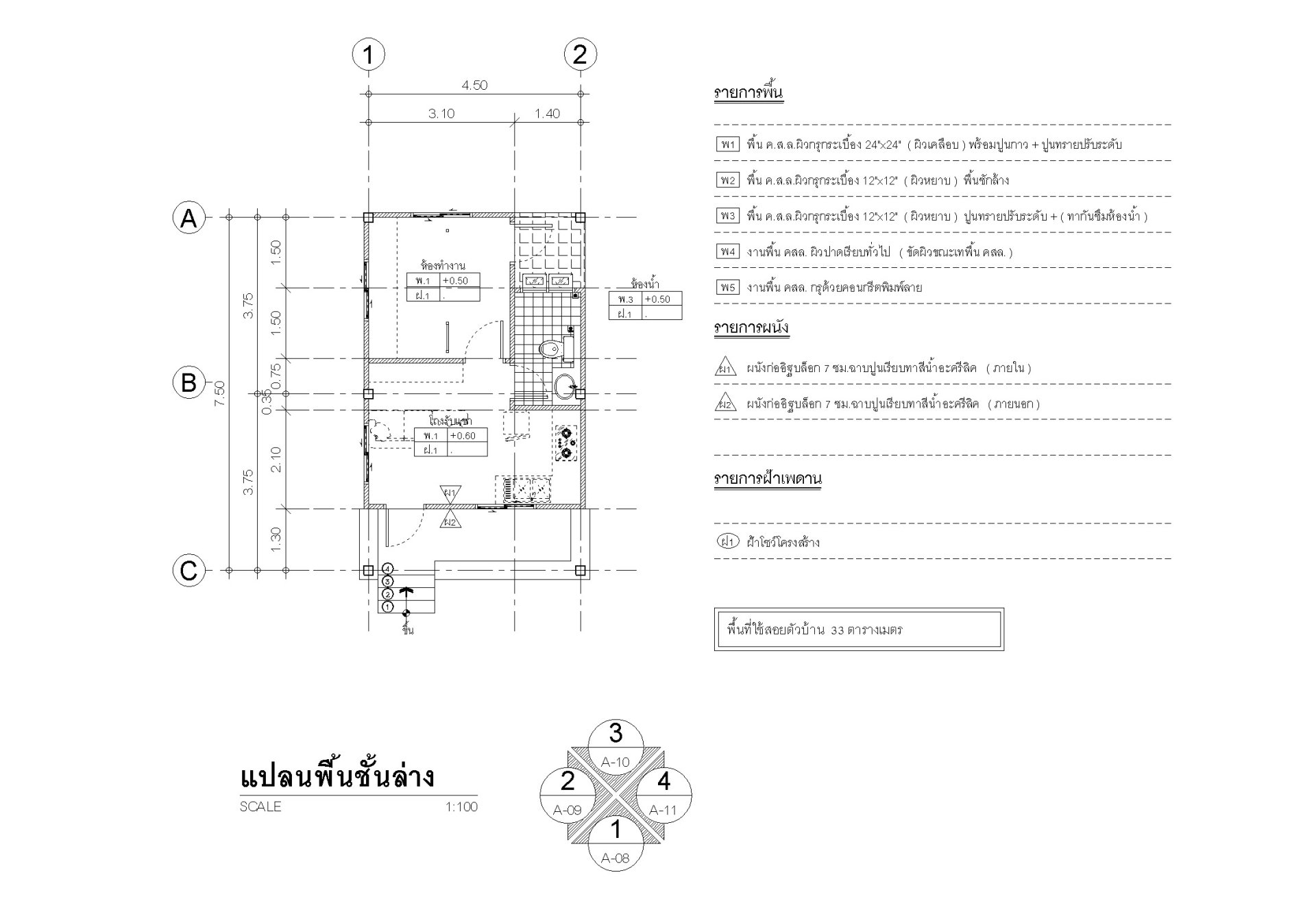 ตัวอาคารกว้าง 4.50 เมตรลึก 7.5 เมตรพื้นที่ใช้สอย 33 ตารางเมตรเหมาะกับคนโสดอยู่ตัวคนเดียวมีห้องนอนและห้องทำงานอยู่ในห้องเดียวกัน พื้นที่วางเครื่องซักผ้า