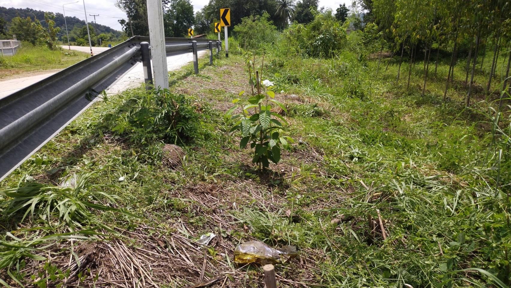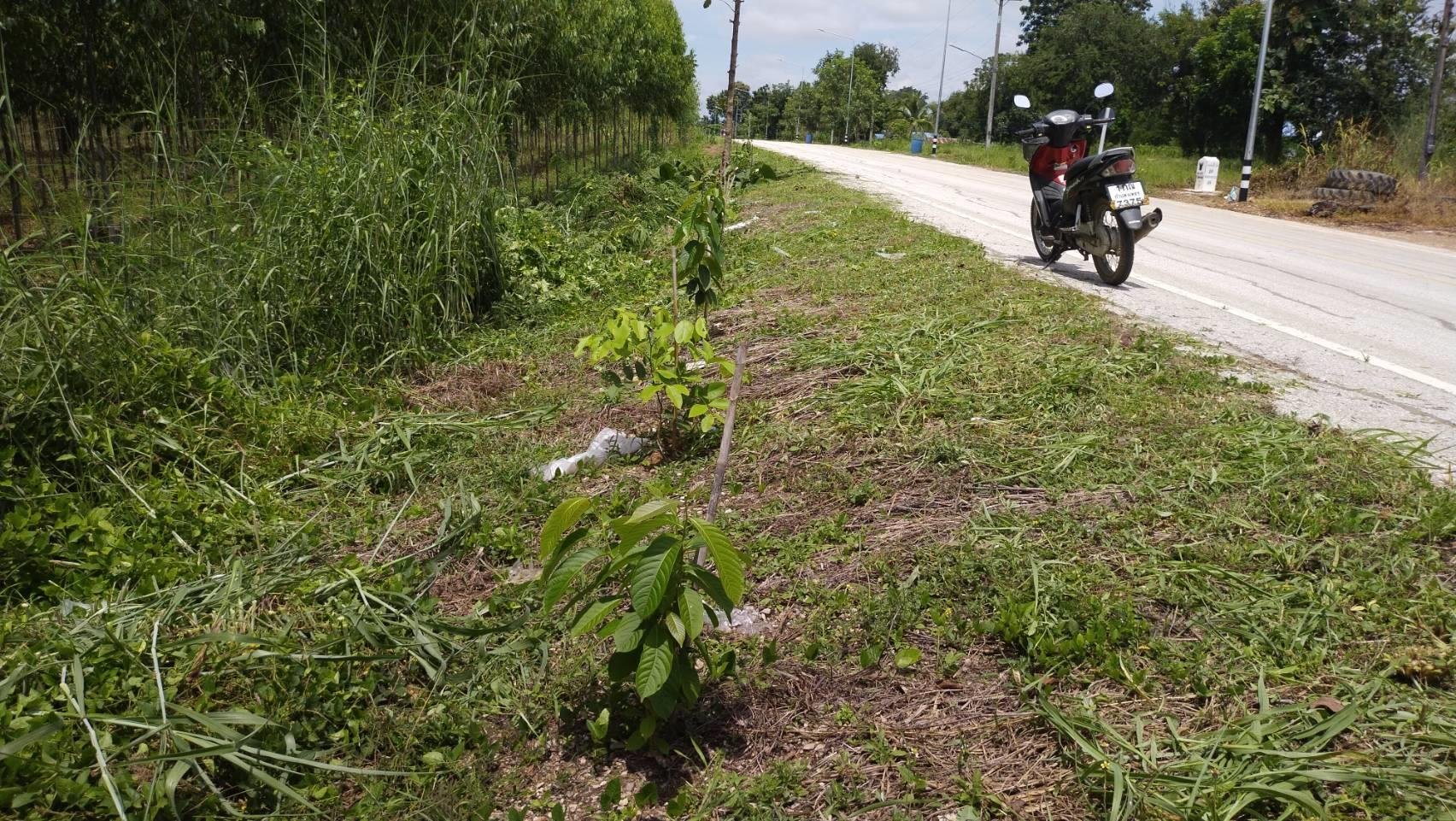ตรงนี้ผมได้ทำการตัดครั้งใหญ่ไป 1ครั้งแล้วรู้ถึงปัญหาของการตัดหญ้า ในระยะทาง 4 กม. หญ้าพอตัดแล้วจะโตเร็วมาก ประมาณ 2 อาทิตย์เริ่มจะคลุมต้นไม้อีกแล้ว ดังนั้นจากประสบอการณ์ที่ผมได้ทำไป ผมจึงวางแผนใหม่ กอรปกับการที่ทางหลวงจะมีงบประมาณมาตัดหญ้าข้างทางหลวงชนบท ปีละ1 ครั้ง ซึ่งเป็นจังหวะที่พอดีมากสำหรับการตัดหญ้าครั้งแรกของผม ผมตัดไปเมื่อวันที่ 12 สิงหาคม 2565 หญ้าโตเร็วมากได้เวลาตัดอีกแล้ว วันนี้วันที่ 5 กันยายน 2565 มีกรมทางหลวงมาตัดหญ้าพอดีเลย ผมจึงได้ประสบการณ์ตรงนี้ ก่อนทีทางหลวงจะตัดหญ้าจาก Global house มาถึงหมู่บ้านผม ผมได้โทรไปพูดคุยกับส่วนการดูแลทางหลวง และได้ขอให้ช่วยดูแลต้นไม้ให้ และสอบถามถึงรายละเอียดต่าง ๆ ในการปลูกต้นไม้ข้างทาง กรมทางหลวงไม่ได้มีข้อโต้แย้งใด ๆ และยังบอกอีกว่าถ้ามีต้นไม้ข้างทางปรกติทางหลวงจะเว้นไว้ ไม่ตัดทิ้ง แต่ต้องเป็นต้นไม้ที่เห็นชัดเจนนะ ตรงนี้ต้องของคุณ นายหัว วีระพันธุ์ เพชรเล็ก ที่ได้ให้ไม้เสียบพริกผมมา ปักต้นไม้ไว้ ทำให้มีจุดเด่นในการดูและต้นไม้ และท่านยังช่วยเหลือให้เงินมาช่วยทำทุนในการเตรียมพื้นที่ก่อนปลูกต้นไม้อีกด้วย