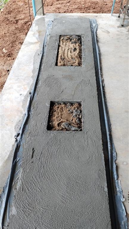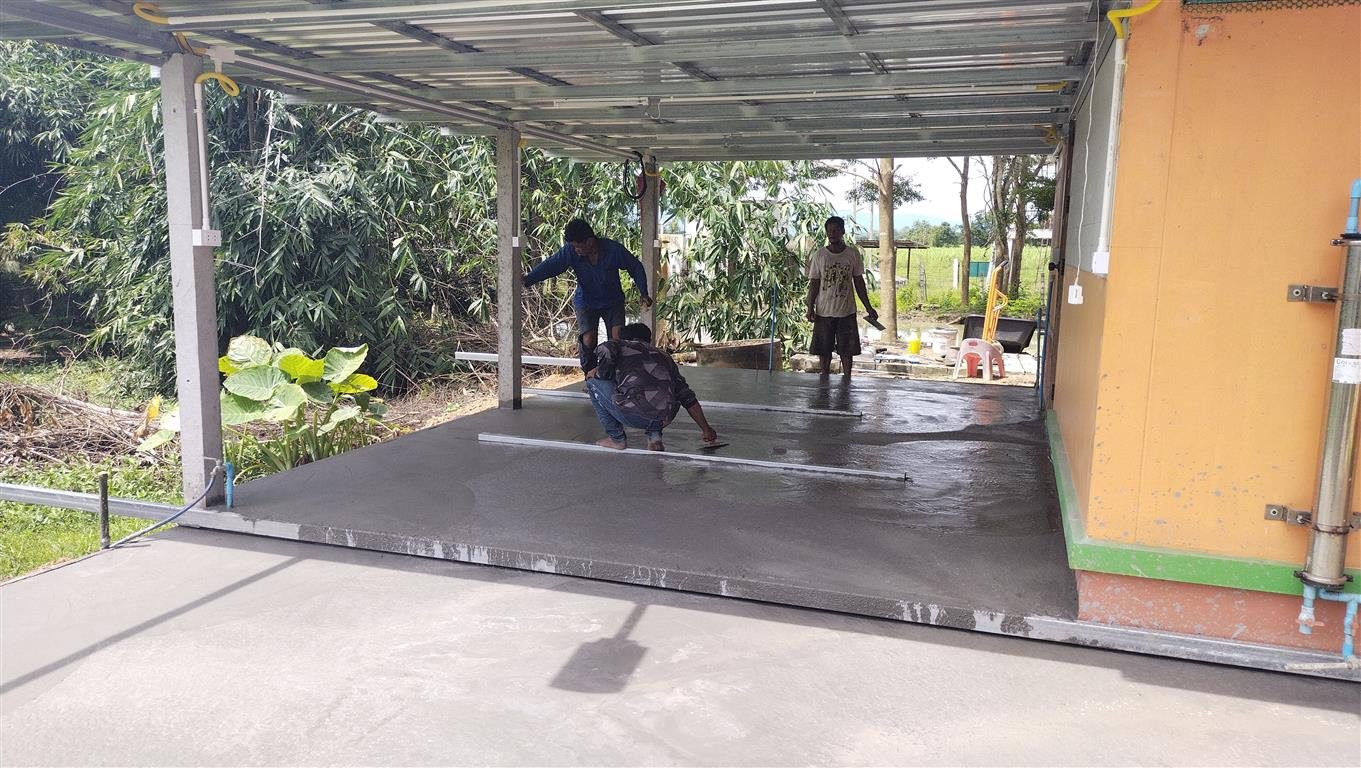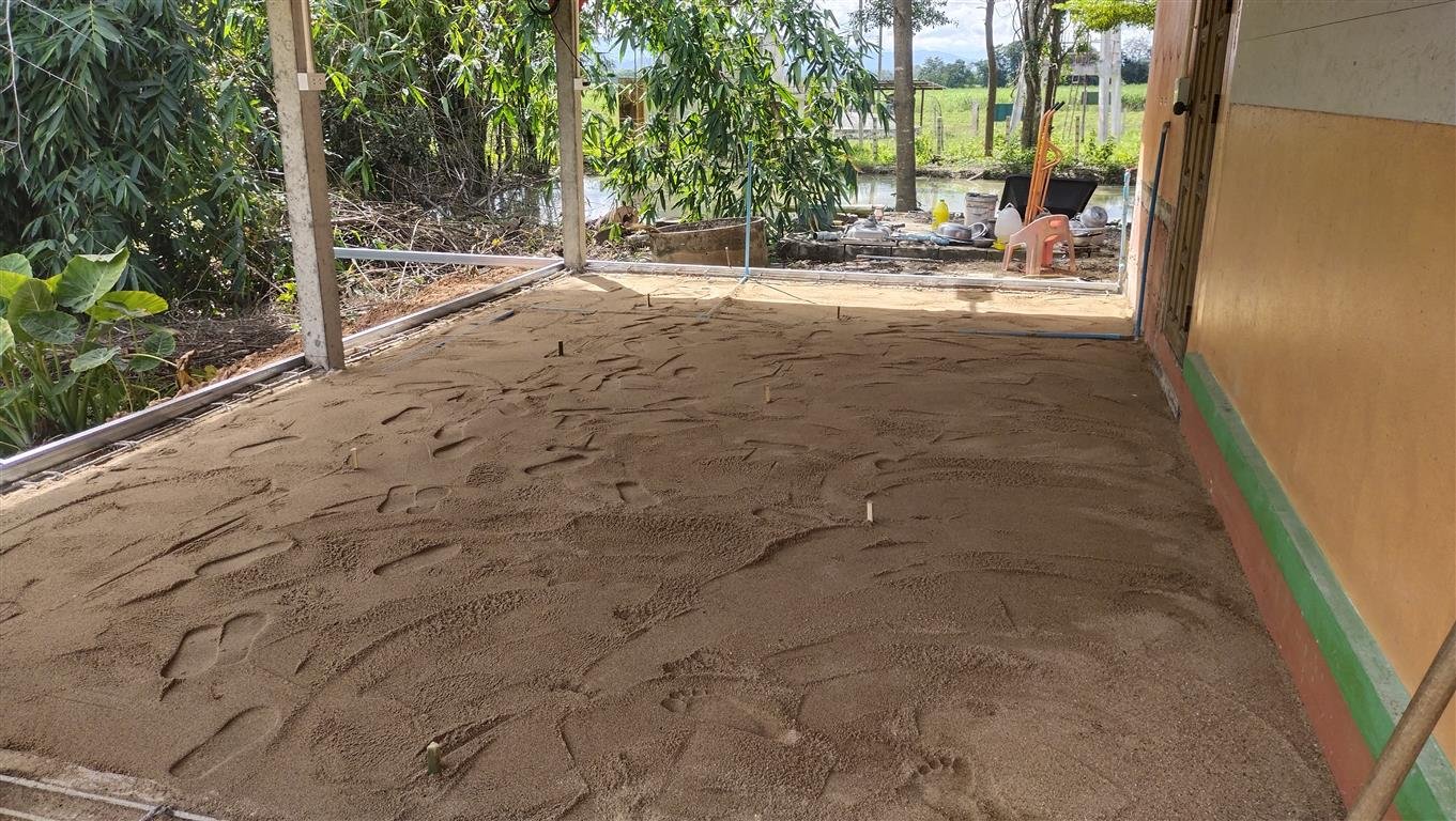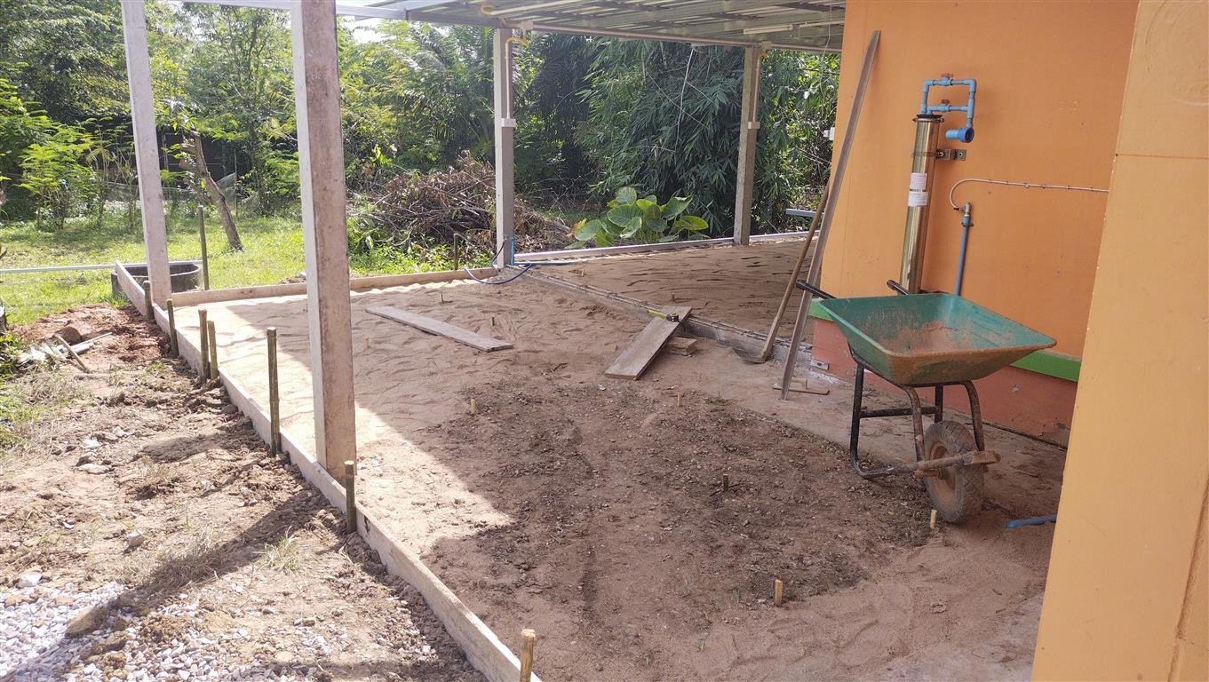 ใช้คอนกรีตในการเทวันนี้ 4 คิวเนื่องจากว่าการสั่งคอนกรีตสำเร็จรูปต้องสั่ง 3.5 คิวขึ้นไปถึงจะไม่เสียค่าส่ง ดังนั้นการวางแผนเทก็ต้องคำนวณเกี่ยวกับปริมาณคอนกรีต ซึ่งผมคำนวณแล้วใช้ที่ 4 คิว ระยะทางหน้าบ้านมาหลังบ้านต้องใช้รถเข็นบรรทุกมาเท ตอนแรกคิว่าจะใช้เวลานาน แต่พอทำงานจริง ๆ แล้วรถเข็น 4 คัน คนปรับพื้นทำงานไม่ทัน ภายในไม่เกิน 1 ชม.ก็เทคอนกรีตจนเสร็จพร้อมกับขัดพื้น ขัดมัน เนื่องจากว่าช่างปูประเบื้องหายาก และช่างที่ใช้งานประจำตั้งแต่ทำงานบ้านหลังนี้นั้นได้เสียชีวิตไป ผมเลยเน้นอะไรที่ง่าย ๆ และทำเอง