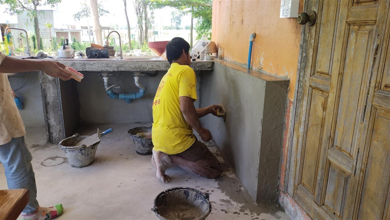 งานฉาบปูนก็มีช่างที่ใช้มาตัดหญ้าประจำ พอดี เขาพอฉาบปูนได้ผมก็ให้มาฉาบ ใช้เวลาฉาบ 2 วันก็เสร็จ เป็นไปตามที่ผมคาดและวางแผนไว้ ใช้คอน 2 คนช่าง 1 กรรมกร 1 คน งานฉาบก็ผ่านไปได้ด้วยดี ส่วนผมก็เก็บขอบเคาเตอร์ เพื่อจะได้ทำงานควบคู่กันไป งานอะไรที่ค่อนข้างต้องใช้ความเข้าใจผมก็จะทำเองเป็นหลัก