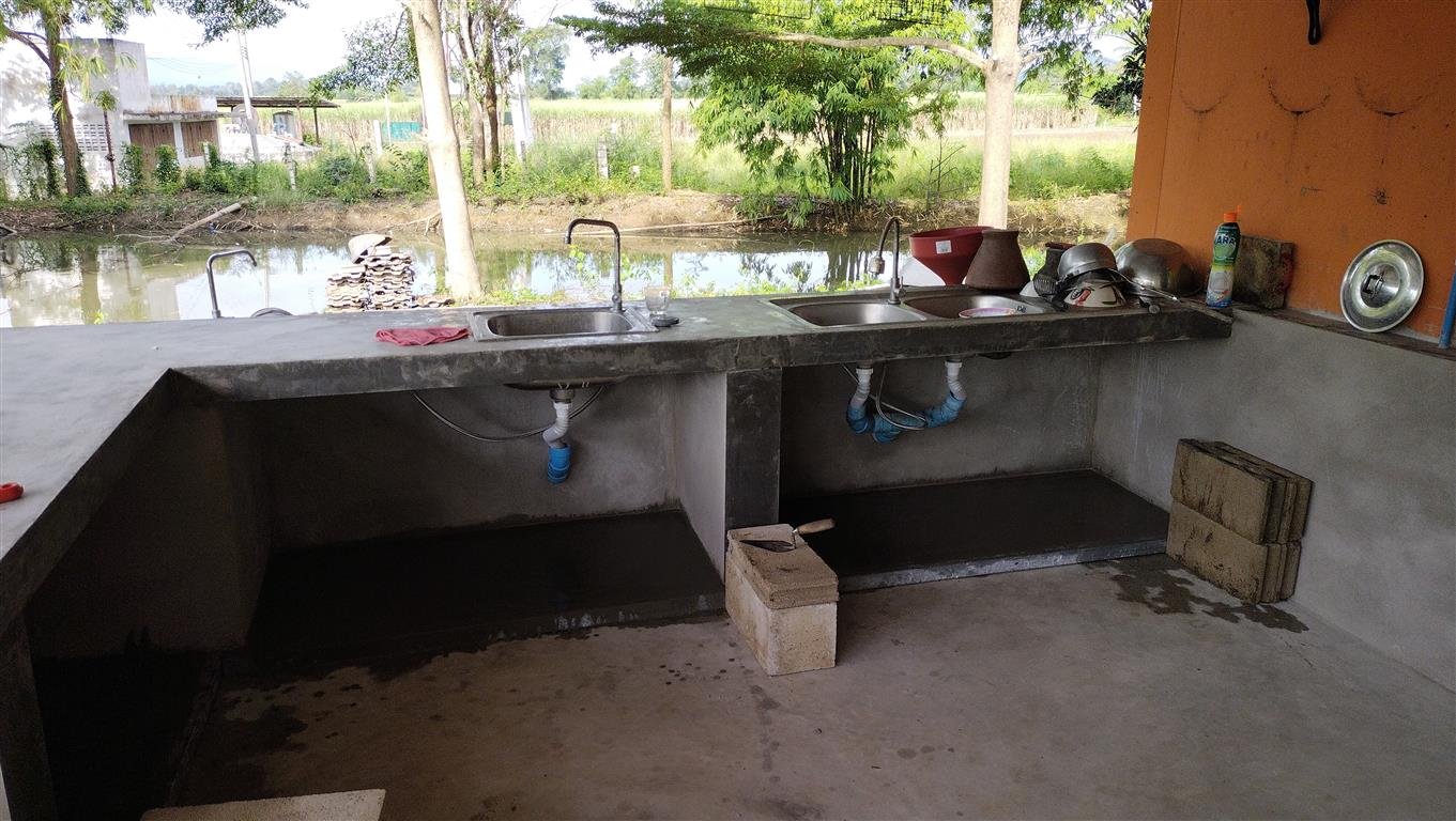 เห็นไหมครับเคาน์เตอร์ยังไม่ฉาบก็ใช้งานได้แล้ว มีการก่ออิฐเต็มหน้าเพื่อรับเคาน์เตอร์ คิดแผนแบบง่าย ๆ ไม่ซับซ้อนยุ่งยาก อ่างผมใส่ไว้สองชุด อ่างสำหรับล้างจานมี 2หลุม อ่างสำหรับล้างผักมีหลุมเดียว แยกกันล้างอย่างชัดเจน การล้างจานจะสะอาดหรือไม่เราสามารถดูคนได้จาก อ่างล้างจาน ถ้าอ่างล้างจานสะอาดแสดงว่าล้างจานสะอาด แต่ถ้าล้างจานแล้วอ่างยังมีเศษอาหารหรือสกปรกอยู่แสดงว่าคนล้างจานล้างไม่สะอาดครับ มองง่าย ๆ