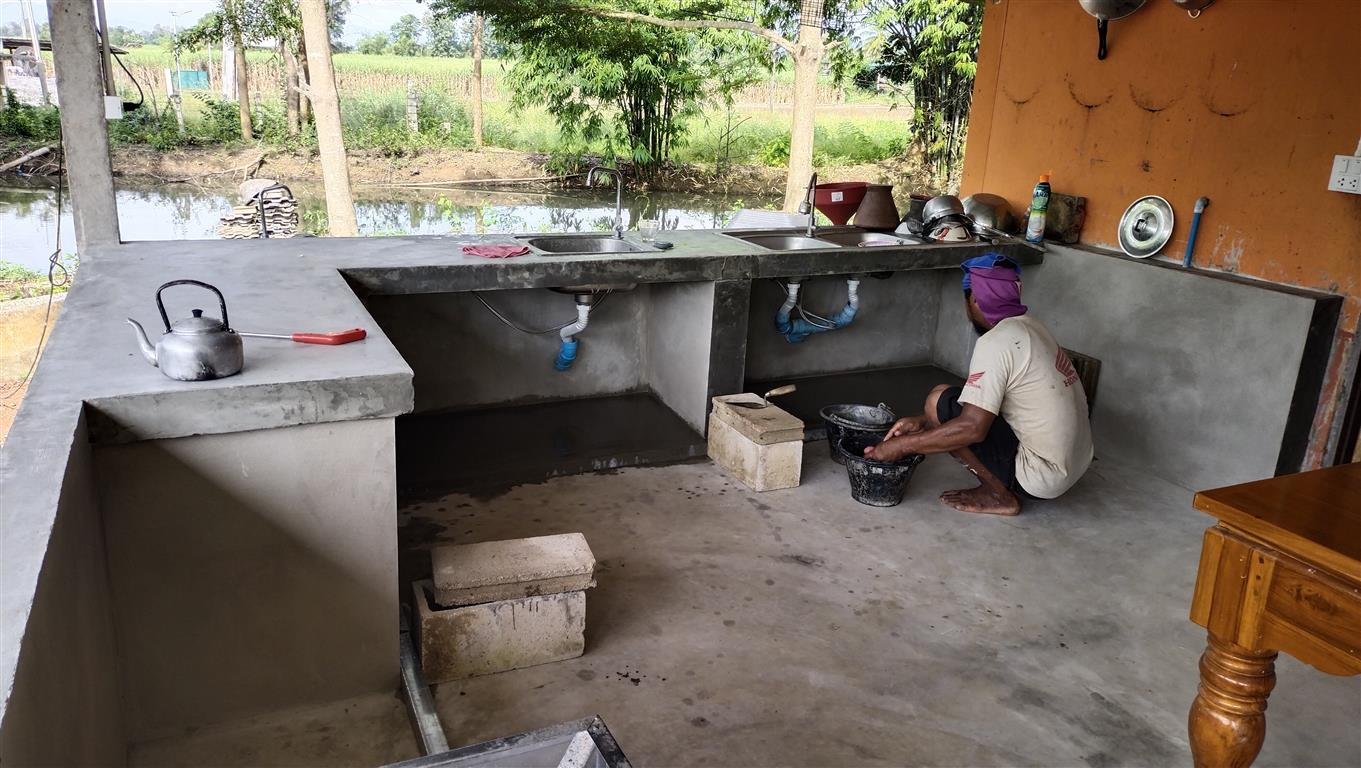 ฉาบเคาน์เตอร์ขัดมันครับ รอขัดด้วยหินถ้วยอีกรอบแล้วค่อยลงน้ำยาเคลือบผิว ด้านล่างเทพื้นไว้สำหรับวางของหนัก อย่างเช่นจำพวก กระติกน้ำบ้าง ครกบ้าง และอื่นที่ใช้บ่อย และหนัก สะดวกในการใช้งาน ด้านขวามีท่อน้ำ ผมก็ก่ออิฐฉาบปูนวางแผนที่จะซื้อชั้นเก็บจานสำเร็จรูปมาตั้ง