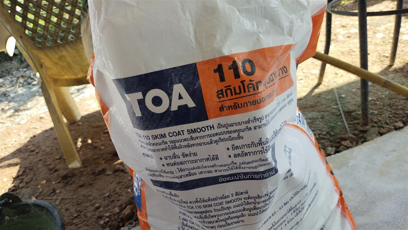 มาถึงขั้นตอนฉาบผิวกันแล้วครับ ผมใช้สกิมโค้ดฉาบบางของ Toa เพื่อผสมสีฝุ่นแล้วฉาบเก็บงาน ผนังเก่าเป็นสีส้มพอดีอยากเปลี่ยนสีเลยใช้สีฝุ่นผสม สกิมโค้ดเข้าไป ก็ได้สีเขียวตามต้องการ