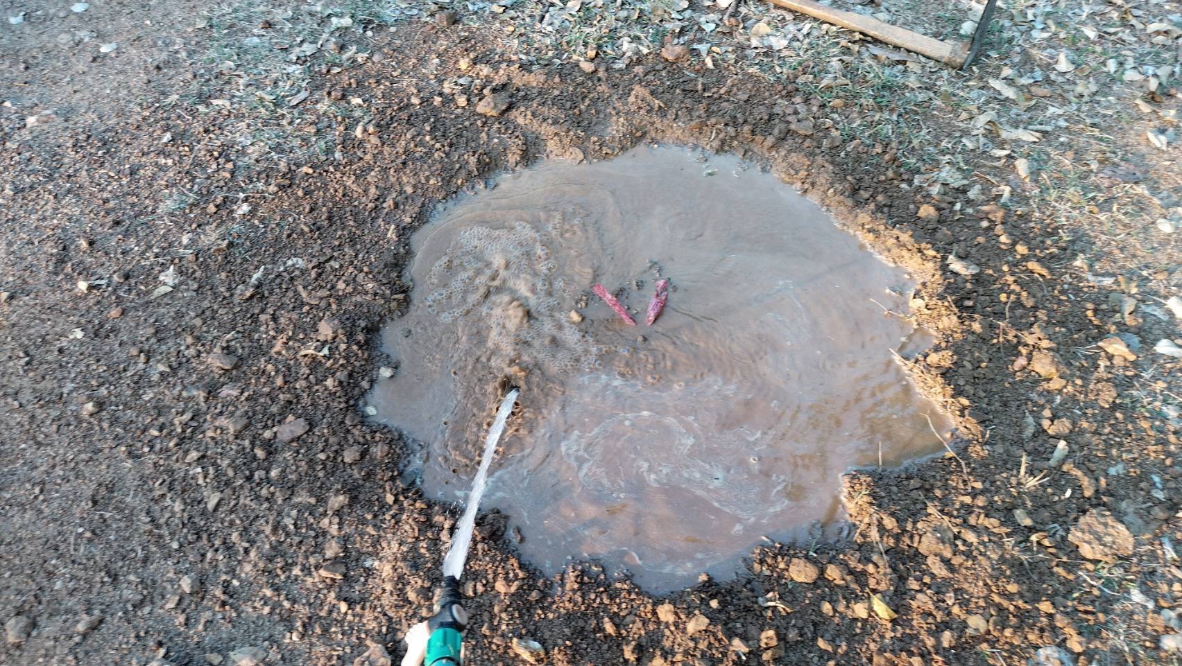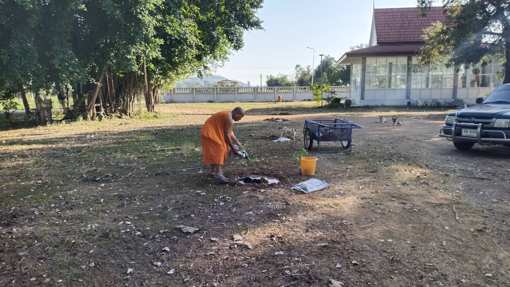 เตรียมขุดหลุมสำหรับปลูกต้นไม้ พื้นที่ดินในวัดมีความแข็งมาก ต้องค่อย ๆ เซาะแล้วขุดหล่อน้ำไว้
